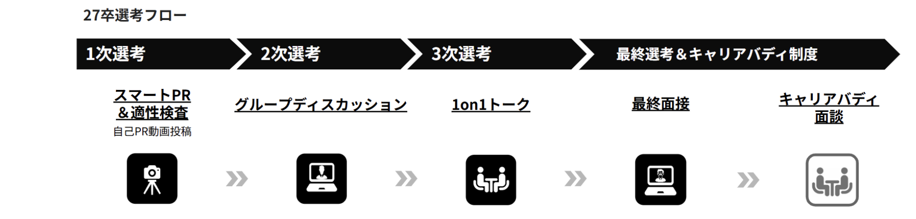 当社では採用面接で面接の形式や面接官を学生が選べるといった制度もあります。このプロセスも、学生自身が常に納得感を持って選考を進められる仕組みとして取り入れています。このように「学生が自分らしい個性を出せる場所を提供したい」という思いから、選考フロー全体を通して、企業と学生で双方向のコミュニケーションが取れる設計にしています。